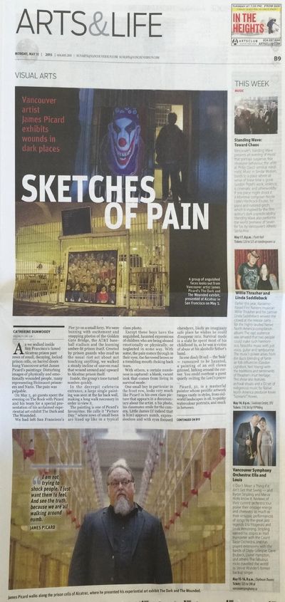 As we walked inside San Francisco’s famed Alcatraz prison past rows of small, decaying, locked prison cells, on barred doors hung Vancouver artist James Picard’s paintings: Disturbing images of physically and emotionally wounded people, many representing Holocaust prisoners and Nazis. The pain was palpable.